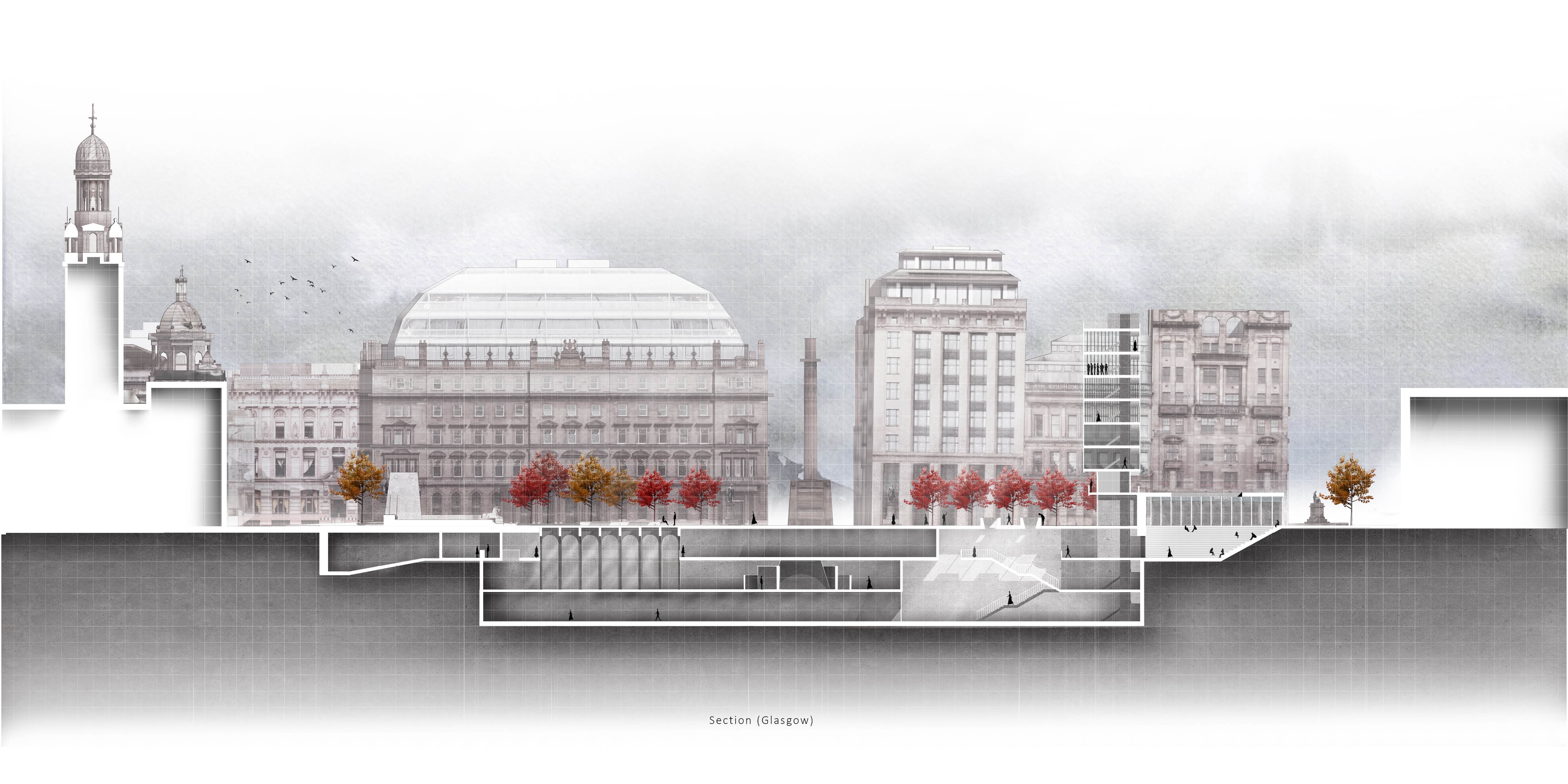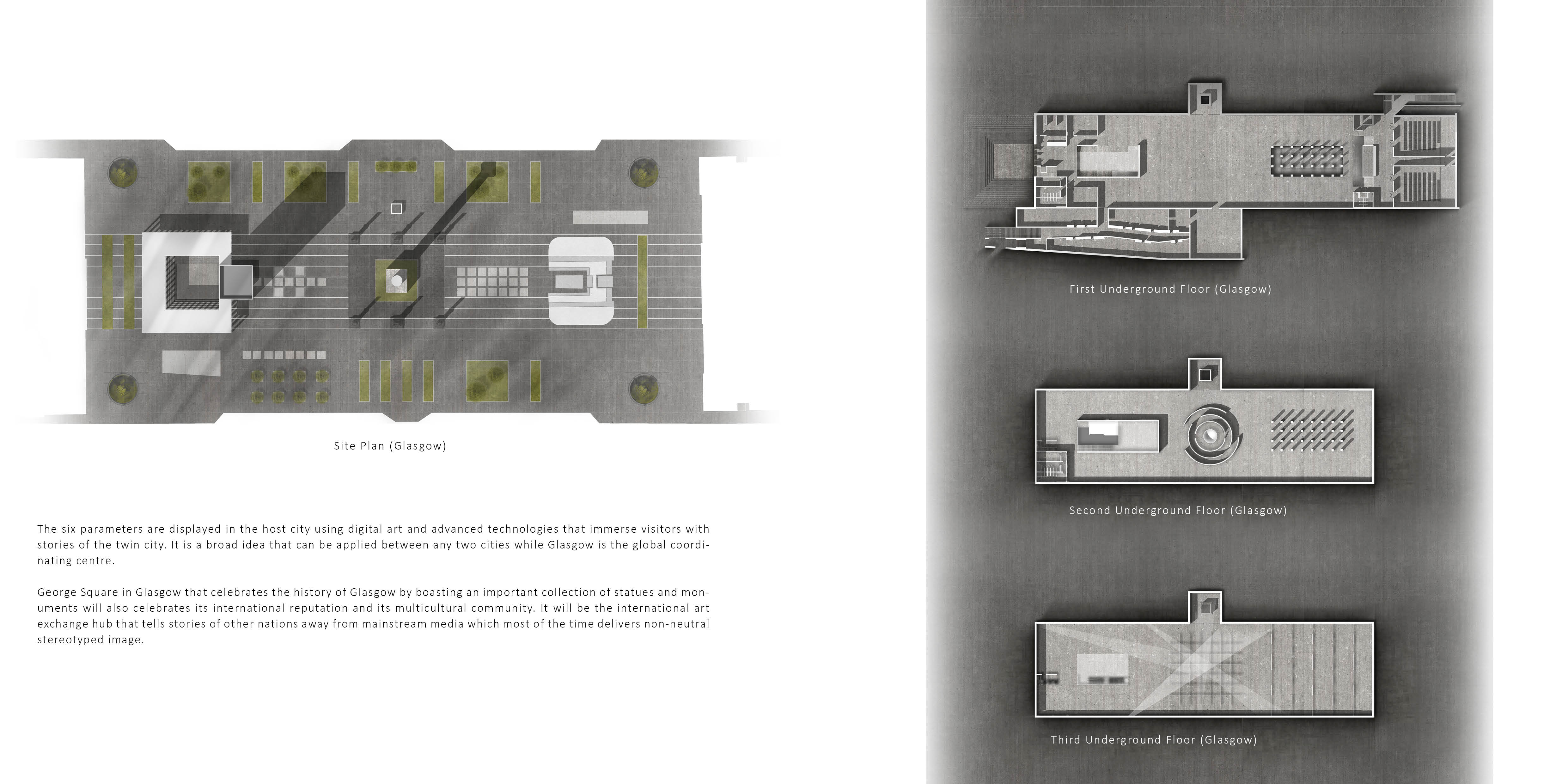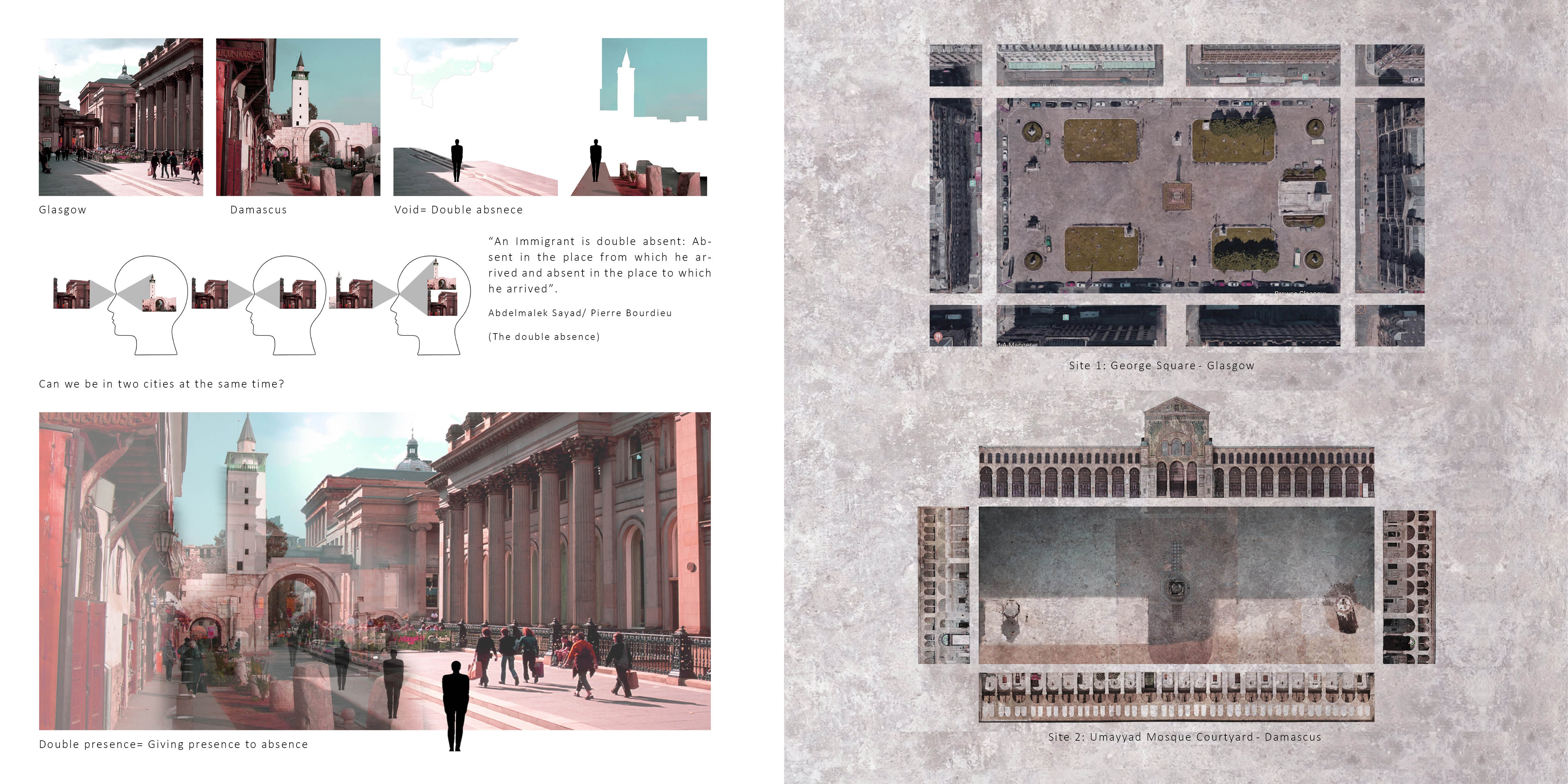 The project reflects six parameters of a city temporarily twinned with another, leaving lasting evidence in both. These include History, Art, Architecture, Culture, Storytelling, and Innovation. It explores how shared experiences and artistic expression can build bridges across cultural, political, and geographical boundaries. The case study focuses on Damascus as the broadcasting city and Glasgow as the receiver. Initial research began with memory-based sketches of Damascus. The idea evolved into a broader exploration of cultural twinning through the transformation of public squares, positioning Glasgow as part of a global cultural network.