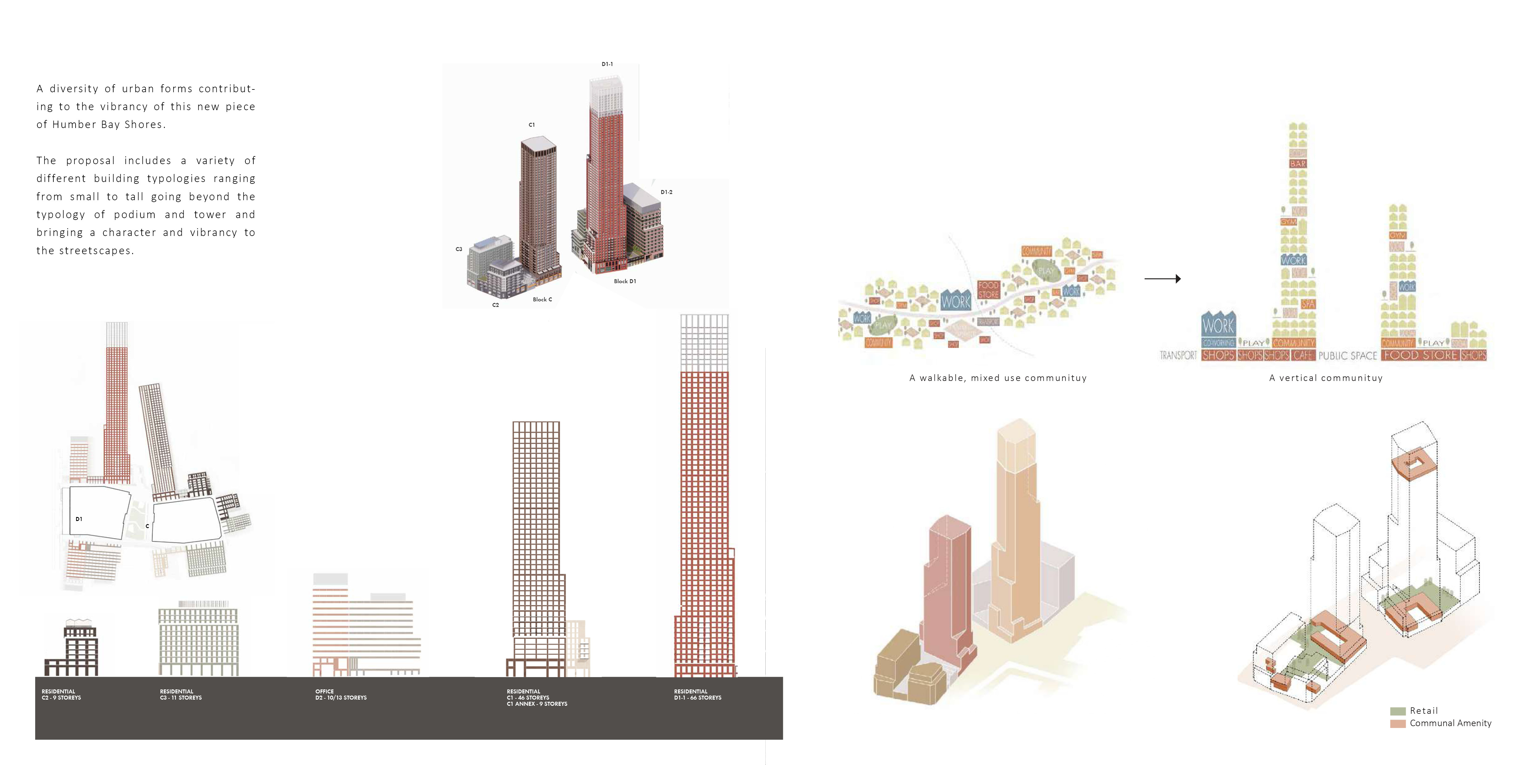 A new neighbourhood in the west end of Toronto, 2150 Lake Shore will deliver the best city life with access to green spaces and a memorable lakefront location. 36 buildings, ranging in height from 4 to 71 storeys, will shape a network of public spaces anchored by three squares, a ravine, a park and a year-round covered galleria. One of the largest developments underway in a fast-changing city, its picturesque urban design aspires to create a lasting and sustainable neighbourhood. Phase 1 delivers two blocks C and D1 that are formed out of three and two buildings respectively. Block D is composed of office, retail and residential, whereas Block C is composed of retail and residential.